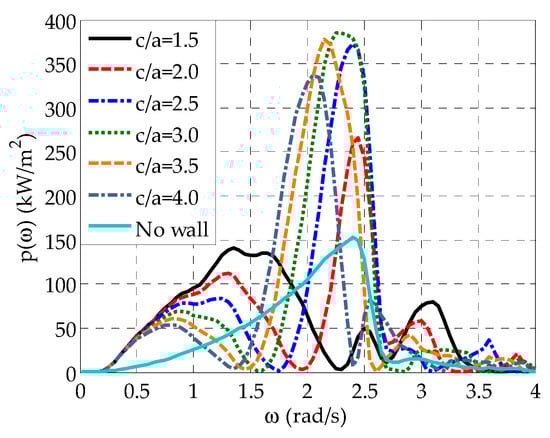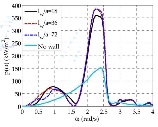 Finally, it is worthwhile to mention that for a given WEC’s geometry, the length of the wall affects at a small degree . Specifically, in the case of (Figure 6a), the existence of more intense wall-edge effects reduces the power absorption ability of the array at rad/s rad/s, leading to slightly smaller peak values in this frequency range as compared with (Figure 6b). However, at smaller frequencies, wall-edge effects seem to have a positive effect on , since at rad/s rad/s slightly larger values are observed for as compared with .