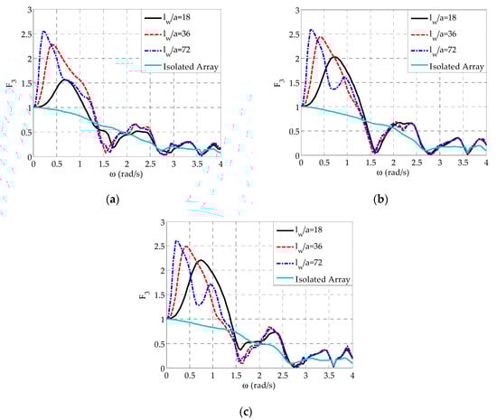 Starting with the heave exciting forces (Figure 10), for all WECs and for varies in a similar manner as in the case of and , already described in Section 3.2 and Section 3.3, respectively. However, for this value, a second peak at rad/s occurs for WECj, , and (Figure 10b,c). The increase of leads to a more rapid increase of , from the limiting value of at rad/s, and thus to a shift of the first peaks (global maxima) at smaller wave frequencies. Moreover, it results to larger values of the aforementioned peaks. The above trends introduce differences in the values of at rad/s rad/s in the case of WECj, , and (Figure 10a,c) and at rad/s rad/s in the case of WECj, and (Figure 10b). Compared to the isolated array, it is straightforward that the presence of the wall, irrespectively of its length, affects the WECs’ heave exciting forces in the whole examined frequency range, since for all values examined, does not demonstrate a continuous smooth decrease as in the case of the isolated array. This in turn leads to different values, especially at rad/s rad/s, where for a great increase of the heave exciting forces occurs as compared with the isolated array.
