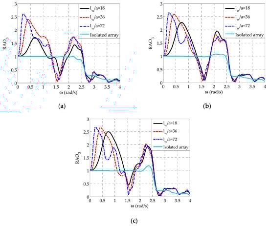 Compared to the isolated array, the results of Figure 8 illustrate that the presence of the wall, has a significant impact on of all the WECs in almost the entire examined frequency range. Specifically, on the one hand, when the array is placed in front of the wall at a small distance from the wall (i.e., and ), the WECs’ heave responses increase significantly mainly at rad/s rad/s, while a great reduction of occurs at rad/s rad/s, especially for . On the other hand, by increasing to values larger than 2, , increases at rad/s rad/s, but, most importantly in the frequency range, where resonance phenomena occur.