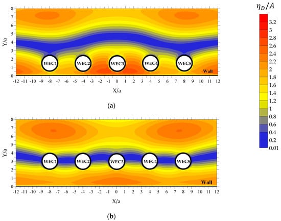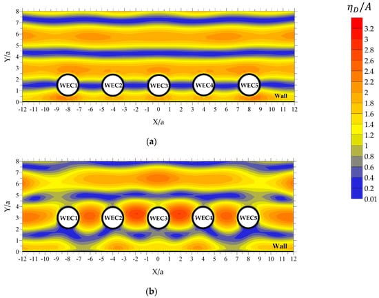 Starting with the case of rad/s, the presence of the wall boundary in the absence of the WECs (Figure 15a), at approximately , leads to the formation of a longitudinal zone, with a sinusoidal-like variation pattern along (coined hereafter “zone A1”), where has values almost equal to zero. Outside of this zone, varies quite intensively and has significant values. By placing the WECs in front of the wall (Figure 13), zone A1 still exists; depending, however, upon the examined value, the zone’s width along and its variation pattern along are modified due to the hydrodynamic interactions among the WECs and between the wall and the WECs. Accordingly, from a physical point of view, the case of (Figure 13a) corresponds to the placement of WECs outside of zone A1. More specifically, the WECs are placed in an area between the leeward side of zone A1 and the wall, where, the combined diffraction disturbances induced by the WECs and the wall amplify the intense variation pattern and the large values of already existing, due to the presence of the wall. As a result, a non-symmetric (with respect to the WECs’ local horizontal axes) diffracted wave field, with significant values, is formed around the WECs. On the other hand, the case of (Figure 13b) is physically equivalent to the placement of the WECs inside zone A1. This in turn, leads to the formation of an almost symmetric (with respect to the WECs’ local horizontal axes) diffracted wave field around the WECs, with quite small values. All the above advocate the existence of larger values for at rad/s as compared with the case of , in absolute accordance with the results of Figure 7.