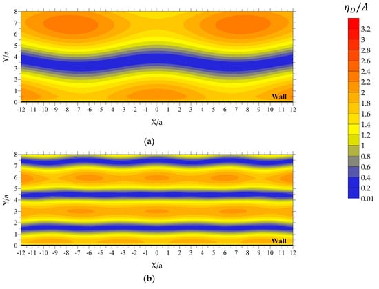 In the case of rad/s, the consideration of incident waves with shorter wave length results in the formation of three distinct longitudinal zones that are almost parallel to the wall, at the seaward side of the boundary (Figure 15b), where has almost zero values. The first zone (coined hereafter “zone B1”) is bounded at approximately , while the second and the third zones (coined hereafter “zone B2” and “zone B3”, respectively) are bounded at approximately and , respectively. These zones remain almost unaffected, when the WECs are placed close to the wall, i.e., in the case of (Figure 14a), whereas for the existence of the WECs modifies the width and the variation pattern of these zones along (Figure 14b). Following a rationale similar to the case of Figure 13, from a physical point of view, the non-dimensional distance from the wall (Figure 14a) corresponds to the placement of WECs inside zone B1. This, in turn, results in the existence of an almost symmetric (with respect to the WECs’ local horizontal axes) diffracted wave field around the WECs, with quite small values. However, the case of (Figure 14b) is physically equivalent with the placement of the WECs in the area between zones B1 and B2, where intense variation patterns and significant values of are observed. Consequently, a non-symmetric (with respect to the WECs’ local horizontal axes) diffracted wave field with significant values is formed around the WECs. All the above advocate for the existence of very small values for at rad/s as compared with , in accordance with the results of Figure 7.