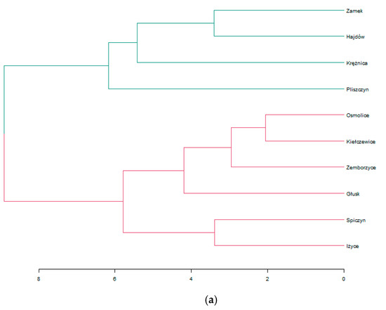 A hierarchical agglomerative cluster analysis was conducted to identify the temporal and spatial variability of water quality parameters at the monitored stations. Ward’s algorithm of minimum variance was used for clustering and the Euclidean distance was applied as a measure of similarity. The obtained results of classification are presented graphically as dendrograms (Figure 2a,b). The measuring sections were grouped into two statistically significant clusters (Dlink/Dmax) × 100 < 60. The first cluster consisted of the stations Pliszczyn, Krężnica, Zamek, and Hajdów (moderate pollution level). The stations Pliszczyn (10) and Krężnica (7) are located in eroded agricultural land, while the stations Zamek (9) and Hajdów (4) are located in an urban area. It follows that both intensive agriculture and urbanization contribute to water pollution. The second cluster includes the stations Kiełczewice (1), Osmolice (2), Zemborzyce (3), Spiczyn (5), Iżyce (6), and Głusk (8), with low water pollution (low pollution level). The investigated basin has a high capacity to retain dissolved chemical compounds. Therefore, the water quality parameters on the outlet stretch Spiczyn (5) have low values. In addition, despite the discharge of sewage from an industrial treatment plant, the Osmolice station was classified in the second group (low pollution level). It is similar in the case of the Hajdów station (moderate pollution level). This is where domestic sewage from the sewage treatment plant for the Lublin urban area (380,000 residents) is discharged. The cluster analysis detected no point source pollution in the form of industrial and domestic sewage discharges. This results from very good management of water resources and the use of the best available technology for wastewater treatment. In addition, point pollution is superimposed on area pollution from surface runoff. Stations located both in agricultural and urbanized areas were classified into one cluster. This indicates a comparable level of area and point pollution.