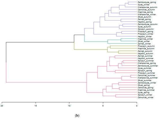 A dendrogram of the hierarchical cluster analysis based on the Euclidean measure and Ward’s method: (a) measuring stations, (b) measuring stations and seasons.