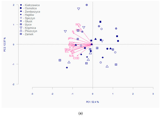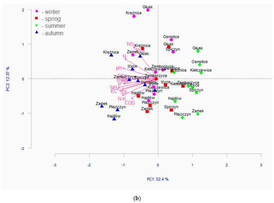 However, the PCA analysis allowed significant differences in water quality to be determined between the testing seasons. With datasets for different periods, the PCA can also be used to investigate the temporal variations in water quality and find out the most important pollution sources for each period. By considering the deadline for sampling, the PCA can also be used to investigate the temporal variations in the water quality (Figure 3b). It can be seen that the first principal component is strongly correlated with the seasons. In particular, we can observe the clusters of samples in the summer and autumn seasons. The samples in the autumn season are characterized by a higher than average concentration of water quality parameters. Samples in the summer season are characterized by a lower than average concentration of the tested parameters. The lowest values of water pollution in the summer may be due to heavy rainfall and nutrient uptake by plants. In turn, in the autumn, rainfall is low, the vegetation period comes to an end, and the source of pollution is plant residues.