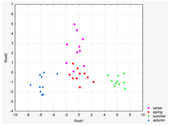 At the final stage of calculations, the discriminant analysis (DA) was performed on the data using a standard stepwise method. This made it possible to build a model containing 13 water quality parameters that were used to characterize the temporal variability of the physical and chemical composition of water in the basin (Table 3). The discriminant analysis allows for building orthogonal functions with a cumulative variance of 97% in the event of temporal variability. The DA was performed on raw data after splitting the dataset into four groups (spring, summer, autumn, and winter) based on the results of the CA and PCA. Since the grouping variable had four categories, three discriminant functions (DF) were obtained (Table 4). Only two of them were statistically significant (p < 0.01). The DA identified six variables (DO, SS, pH, N-K, N, and P-PO4) as the most important discriminating variables (Table 5). The first discriminant function is weighted most heavily by the SS and N (Table 6). The second function seems to be marked mostly by P-PO4 and EC. The graphical presentation of DA results is shown in Figure 4. It can be stated that we obtain discrimination between the summer and autumn seasons by means of the first discriminant function. However, the second discriminant function seems to distinguish between winter and autumn seasons.