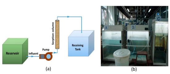 Based on the concept of a combined approach of external–internal P adsorption, the simulated river–lake system (Figure 1) was set up with an inflow rate of 57 L/day for 14 days during the experiment. First, 0.8 m3 of simulated river water was flowed through the adsorption column (Ø 4 cm and height 60 cm) in order to test the external P-capturing treatment. The columns were filled with LAH–zeolite-coated adsorbent. The water/adsorbent contact time in the adsorbent columns was 16 min and the hydraulic loading rate was 45 m/day [29]. To simulate river water, the P concentration of the influent was set at the level of 230 µg/L [9]. The effluent water passed through the column and then flowed into the receiving tank. The receiving tanks (1 m3) were made of PVC and glass (panel only) with the dimension of 1 m × 1 m × 1 m in length × height × width. Additional P adsorbent was placed in the receiving tanks for in-lake P capturing. The treatment systems were designed in duplicate, and another system without any LAH adsorbent was run as the control. The size of the tank for the control system was 0.375 m3 (0.5 m × 0.5 m × 1.5 m) due to the unavailability of the same sized tank as was used with systems A and B.