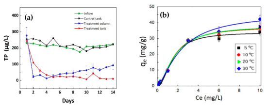 Figure 3a shows the similar pH values (p > 0.05) between the tank outflow (range of 7.6–8.0) and the inflow (pH = 7.5), which support the idea that the LAH adsorbent exhibited limited aquatic environmental disturbance. Besides P, the accumulation of nutrient N in water is also a significant factor that could cause water eutrophication [39]. In this study, TN concentrations generally remained at the same level (average of 12 mg/L) throughout the experiment (Figure 3b). This result agrees with the previous study on LAH, where the adsorbent had slight or no significant effect on the concentration of N [26]. When considering future engineering applications, improvements in coating materials could be made so that N may be removed simultaneously. For example, materials such as resins could be considered as a coating material, instead of zeolite, which may provide an additional function for N removal [40].