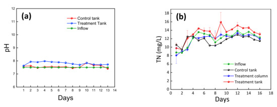 The dynamics of pH (a) and total nitrogen (TN) (b) in the inflow and outflow from the adsorption columns and tanks.