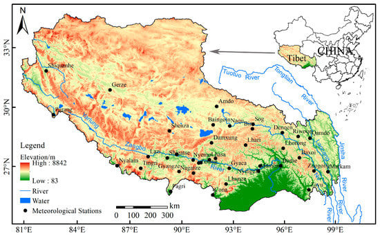 The Tibetan Plateau is part of and located in the southwestern part of the Qinghai–Tibet Plateau. It has a total area of about 1.2 million km2 and an average elevation of 4000 m, which gave it its designation as the “roof of the world”. Most of the Tibetan Plateau is arid and semi-arid. Precipitation has an uneven distribution and large spatial differentiation. The southeast area has annual precipitation of 600–800 mm, while the western area suffers from drought with annual precipitation of less than 200 mm. Precipitation from May through October accounts for more than 80% of the annual total. The spatial distribution of precipitation indicates a decreasing trend from the southeast to the northwest []. Mean annual temperature varies between −3.0 and 11.8 °C, and daily temperature fluctuations are often as much as about 15 °C []. The region experiences soil erosion, desertification, and mountain hazards. Grasslands make up the largest proportion of land cover, accounting for 56.72% of the total land area in the region. The proportion of cultivated land is 0.42% and it is mainly found in southern Tibet, with a small amount distributed in the east and southeast. Due to the high altitude in the northwestern region, the snow cover and frozen soil make this area unsuitable for human habitation, and the level of human activities is thus low. Thirty-eight meteorological stations used in this study are primarily found in the eastern and southern parts of the Tibetan Plateau, with very few in the northwest (Figure 1).