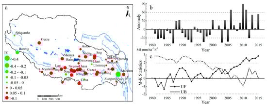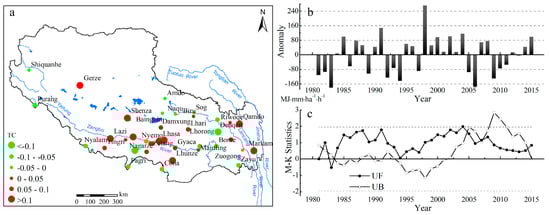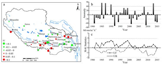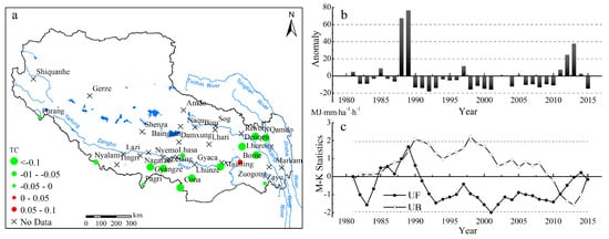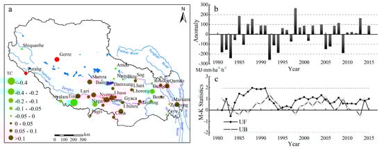 The trend coefficient (a), anomalies (b), and M–K test (c) for annual rainfall erosivity from 1981 to 2015 in the Tibetan Plateau. Note: Dots are scaled according to trend magnitude. The red color corresponds to an increasing trend, and the green color corresponds to a decreasing trend. UF > 0 indicates an increasing trend, UF < 0 indicates a decreasing trend. The mutation year exists at the intersection of UF and UB.