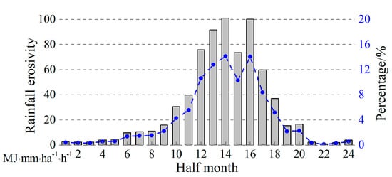 The distribution of rainfall erosivity over the 24 and a half months is an input factor for many soil erosion model calculations, including the Chinese Soil Loss Equation (CSLE) [] and for calculating vegetation cover and biological measure factors. Data from 1981 to 2010 indicated that rainfall erosivity in the Tibetan Plateau was mainly concentrated in June–September, accounting for 81% of the year (Figure 3). This was closely related to the monsoon climate of the Tibetan Plateau, as monsoons account for 58.5% of the annual precipitation []. The proportion of rainfall in May–October accounted for 90% of the rain in the eastern part of Tibet []. Therefore, the rainy season was also a frequent period of soil water erosion.