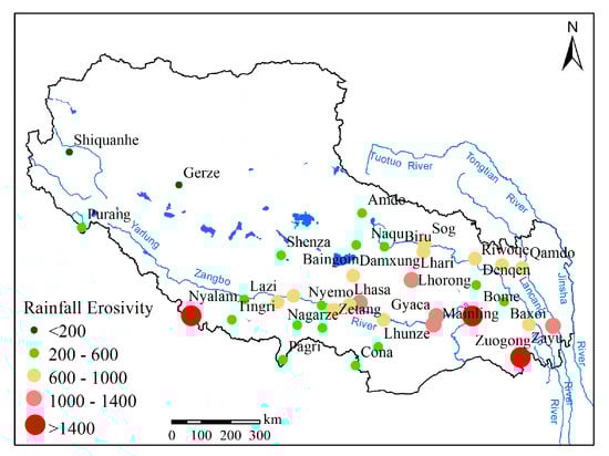 Spatial distribution of rainfall erosivity in the Tibetan Plateau showed a decreasing trend from the southeast to the northwest (Figure 8). The average annual rainfall erosivity at 38 meteorological stations varied from 61 to 1776 MJ·mm·ha−1·h−1 during the study period, with an average of 714 MJ·mm·ha−1·h−1. The largest annual rainfall erosivity was observed at the Bome station in the eastern part of the Tibetan Plateau, and the smallest at the Shiquanhe station in the western region (Figure 8). Rainfall erosivity was <500 MJ·mm·ha−1·h−1 at 24% of the stations, 500–1000 MJ·mm·ha−1·h−1 at 55%, and >1000 MJ·mm·ha−1·h−1 at 21% of the stations. Relatively high rainfall erosivity was mainly distributed in the Hengduan Mountains in the eastern part of the Tibetan Plateau and in the low-elevation areas between the Yarlung Zangbo and Nu rivers.