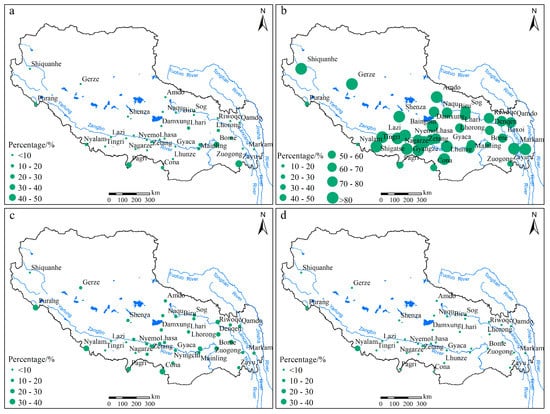 The seasonal distribution of rainfall erosivity varied greatly across the Tibetan Plateau; the average summer rainfall erosivity was 482 MJ·mm·ha−1·h−1, accounting for a maximum of 67.5% of the annual rainfall erosivity, followed by autumn and spring, accounting for 18.5% and 11.5%, respectively. The proportion of winter rainfall erosivity was the smallest at only 2.5%. Seasonal variability in rainfall erosivity varied among meteorological stations, but generally followed rain distribution in summer > autumn > spring > winter (Figure 9). The proportions of spring to annual total rainfall erosivity differed among meteorological stations. The Shiquanhe station had the smallest proportion at 0 and the Zayu station in the Hengduan Mountains had a proportion of 46.5%. Meanwhile, the proportion in the south was higher than in the north, and higher in the east than in the west, resulting in a slight decreasing trend from the southeast to the northwest (Figure 9a). The proportion of summer rainfall erosivity varied from the smallest of 16.4% at Nyalam, to the largest of 94.7% at Shiquanhe station. In addition, 71% of the stations accounted for more than 70% of summer rainfall erosivity, and summer rainfall erosivity in most meteorological stations in the southern Tibet Valley contributed more than 80% to the total (Figure 9b). The proportion of autumn rainfall erosivity at each meteorological station varied between 5.3% and 39.4% with the highest at Purang station, followed by the Nyalan and Cona stations; these stations were located on the southernmost edge of the Tibetan Plateau (Figure 9c). The proportion of winter rainfall erosivity to the total was small, with less than 4% of the stations contributing >90% of the winter erosivity. In that, the Nyalam station contributed the most at 33.9%, followed by Purang, both located on the southwestern edge of the Tibetan Plateau (Figure 9d).