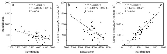 Topography and monsoon affect rainfall distribution in the study area. The higher the altitude, the less the rainfall (Figure 10a). High altitude and atmospheric circulation patterns have created a cold, dry, and fragile environment, which is very sensitive to soil erosion. Weak rainfall erosivity can cause very severe soil erosion, and terrain has an important influence on the distribution of rainfall erosivity in the Tibetan Plateau. Previous studies have shown that altitude, slope, and aspect affect transport of water vapor and the spatial distribution of precipitation in the study area []. The relationship between the average annual rainfall erosivity and altitude of meteorological stations revealed a high correlation coefficient (−0.63), with rainfall erosivity decreasing with increasing altitude (Table 6, Figure 10b). The main factors affecting rainfall erosivity were rainfall and rainfall intensity. There is a strong correlation between rainfall and rainfall erosivity in the study area (Figure 10c). The correlation coefficient is as high as 0.92.