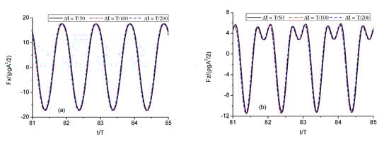 The normalized hydrodynamic force histories on the barge for different time step: (a) Horizontal forces; (b) vertical forces.