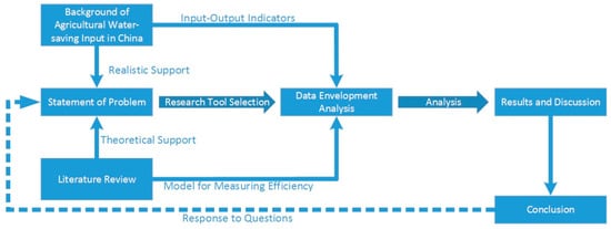In the existing research, the efficiency of agricultural water-saving input between provincial regions has not been measured well, making it impossible to analyze the influencing factors of agricultural water-saving input efficiency. It is necessary to determine the efficiency of China’s agricultural water-saving input, ranking the areas where water technology improvement is needed the most. Determining the factors that affect agricultural water-saving input efficiency and trying to formulate proposals to improve the efficiency of agricultural water-saving inputs are of great significance to promote the rational use of water resources in China. The current forms of agricultural water-saving input are capital, labor, and equipment. Agricultural water-saving effects are primarily reflected in the size of water-saving irrigation areas. When the input and output indicators are clear, the DEA is a more accurate and commonly used tool for researching input efficiency analysis. The theoretical framework of this research is shown in the Figure 2.