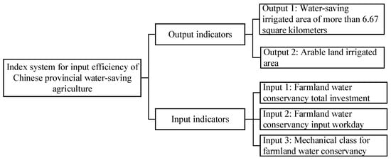 In response to the irrigation water crisis, the Chinese government implemented water-saving technological transformation through agricultural irrigation infrastructure of methods such as the old ditch pumping station throughout the country, thereby transitioning irrigation behavior from traditional irrigation to water-saving irrigation. At present, the input in agricultural water-saving not only includes funds but also the input of human resources and materials. Therefore, we chose the input indicators considering three aspects: labor, material, and funds. According to the statistics of the indicators, we used three indicators: farmland water conservancy total input, farmland water conservancy input workday, and mechanical class for farmland water conservancy to represent agricultural water-saving inputs. In terms of the agricultural water-saving output, separating the portion of the grain output that has been increased due to water-saving irrigation is difficult. Additionally, the grain output is considerably affected by natural factors. The arable land irrigated area and water-saving irrigated area of more than 6.67 square kilometers were used as the output indexes of water-saving irrigation. The index system used to determine the efficiency of Chinese provincial water-saving agriculture is shown in Figure 3.