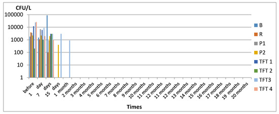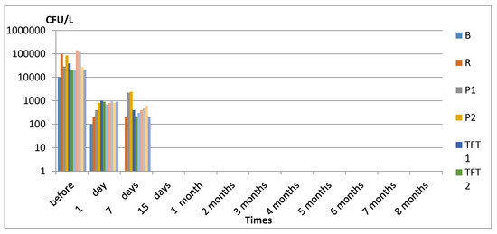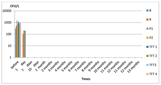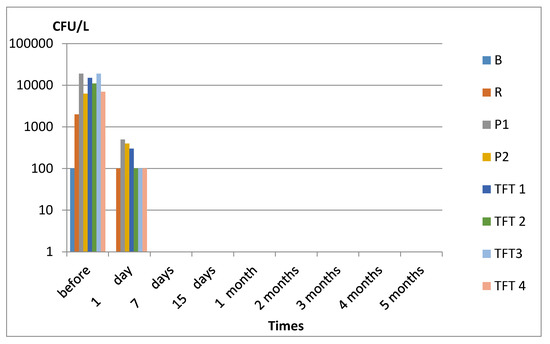 Before the TFT installation, Legionella pneumophila sg1 was detected in Hospital 4. Legionella counts ranged from 1 × 102 to 1.9 × 104 CFU/L, with a mean value of 9.9 × 103 ± 2.8 × 103 CFU/L. Following the implementation of TFTs and water treatment, from February 2018, Legionella pneumophila sg1 was detected for one day (2.2 × 102 CFU/L). Legionella pneumophila sg1 was no longer detected from the seventh day (T2) (Figure 4).