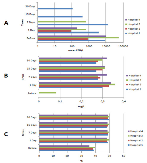 In Hospital 3, total chlorine concentrations were between 0 to 0.1 ± 0.02 mg/L, while hot water temperature values ranged from 32.8 ± 1.8 to 50.7 ± 1.6 °C before TFT installation. Continuous chlorination was maintained at mean values between 0.25 ± 0.01 to 0.40 ± 0.01 mg/L, while mean temperature values ranged from 44.8 ± 1.8 and 50.7 ± 1.6 °C (Table 3).