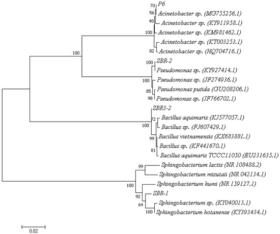 The genomes of the four heterotrophic nitrifying strains were used as templates to carry out PCR amplification, and partial 16S rRNA fragments of the four strains of bacteria were obtained. A neighbour-joining tree based on the 16S rRNA gene sequences was constructed to show the phylogenetic positions of SBR3-2, SBR-1, SBR-2, P6, and representatives of some other related taxa. Bootstrap values (expressed as percentages of 1000 replications) are shown at the branch points; the scale bar represents 0.02 substitutions per nucleotide position. The measured sequences were compared to nucleic acid sequences in the GenBank database. By comparing the results and morphological characteristics mentioned above, strains SBR-2, P6, SBR3-2, and SBR-1 were identified as Pseudomonas sp., Acinetobacter sp., Bacillus sp., and Sphingobacterium sp., respectively, and their sequence similarities were all over 99%. An NJ tree was constructed using MEGA 7.0.26 (Figure 1).