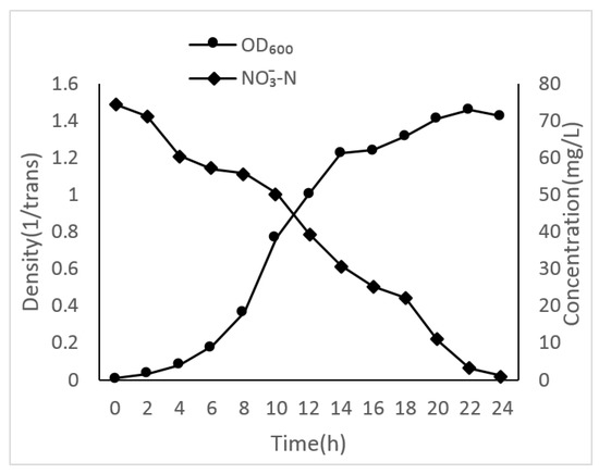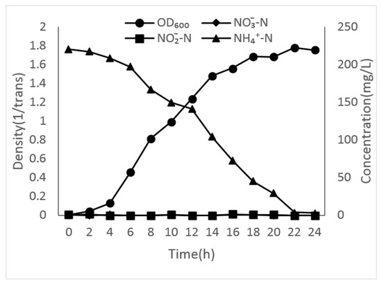 The growth curve of the synthetic microbial community cultured in nitrification medium with NaNO2 as the sole nitrogen source for 24 h is shown in Figure 4, and the removal efficiency of ammonia nitrogen and COD was 98.60% and 76.45%, respectively. The synthetic microbial community was in the adaptation period from 0 to 2 h. After 2 h, the strain population increased rapidly into the logarithmic growth phase, and the population reached a maximum after 22 h. Although generally, high nitrite concentrations were toxic to the strain and inhibited its growth and metabolism, some strains, such as Y-11, have a certain tolerance to high nitrite [42]. Similarly, the synthetic microbial community showed better tolerance and denitrification capacity.