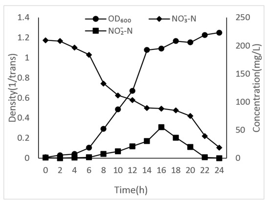 The growth curve of the synthetic microbial community cultured in nitrification medium with KNO3 as the sole nitrogen source for 24 h is shown in Figure 3, and the removal efficiencies of ammonia nitrogen and COD were 95.02% and 65.65%, respectively. The same observation method revealed that the synthetic microbial community was in the adaptation period from 0 to 2 h. After 2 h, the strains grew rapidly into the logarithmic growth phase, and the population was still increasing after 24 h. The concentration of NO3− decreased slowly from 0 to 2 h, and the efficiency of decline increased significantly at 2 h; NO2− accumulated throughout the reaction process. This result was in contrast to some heterotrophic nitrification-aerobic denitrification strains, such as LD3 [40], that have a large amount of nitrite accumulation during the reaction. Because nitrite reductase and nitrate reductase existed simultaneously in the synthetic microbial community and had high activity, the nitrite nitrogen produced during denitrification was rapidly reduced by the high-activity nitrite reductase [41].