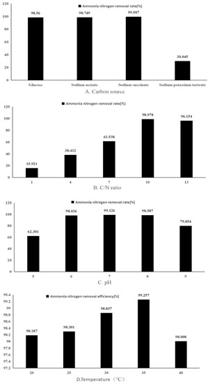 The NH4+-N removal percentages were significantly different among C/N ratios of one to 13, as shown in Figure 5. According to the experimental data, the ammonia nitrogen removal efficiency was only 15.92% when the C/N ratio was one, and the main reason was that an insufficient carbon supply could damage both microbial growth and the denitrification of electron donors [44]. As the C/N ratio increased, the ammonia nitrogen removal efficiency increased gradually until the C/N ratio reached 10, and the ammonia nitrogen removal efficiency reached a maximum at 98.98%. However, when the C/N ratio increased from 10 to 13, the ammonia nitrogen removal efficiency decreased, and the explanation was as follows: the higher carbon-nitrogen ratio made the carbon source content so high that some organic matter was directly embedded into the enzyme structure, affecting enzyme activity [45]. Experiments have shown that the amount of organic carbon plays an essential role in cell growth and denitrification. If the carbon source was insufficient, there was not enough electron flow to provide enough energy for the growth of the cells, and thus the denitrification capacity was relatively low. If the carbon source provided had a much higher content than the demand of the cells, the carbon source was no longer a limiting factor; the growth and metabolic activity of the cells were in a stable phase and can even have undergone reverse growth, and the denitrification capacity was stabilized or decreased. The experimental results showed that the optimal carbon to nitrogen ratio was 10, and the findings for other denitrifying bacteria, such as Vibrio diabolic SF16, seem consistent [46].
