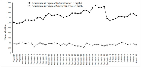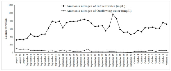 In this application, a bioenhancement scheme was mainly adopted, and the optimized synthetic microbial community was added to the SBR reactor. To enhance the ammonia nitrogen and nitrate removal performance, the reaction conditions were adjusted to the optimal conditions obtained by experimental analysis, i.e., glucose as a carbon source, a C/N ratio of 10, a pH of 7, and temperature of 30 °C. The SBR reactor had been operating stably for 40 days, and the average ammonia nitrogen concentration of the effluent water, the average ammonia nitrogen removal efficiency, and the average COD removal efficiency were 42.53 mg·L−1, 92.61%, and 76.45%, respectively, as shown in Figure 6 and Figure 7. To confirm whether ammonia nitrogen eventually became nitrogen gas, the total nitrogen was detected in the effluent. The total nitrogen value per day was slightly higher than that of ammonia nitrogen, which proved that the ammonia-degrading composite agent had indeed played its intended role and completed the biological denitrification process of ammonia from nitrogen to nitrogen. It is worthwhile mentioning that due to the rain, the effluent was diluted, and the ammonia nitrogen in the inlet water was lower than usual. According to the analysis, the excessively high ammonia nitrogen concentration in the inlet water would not be suitable for microbial reactions. After the ammonia nitrogen concentration was appropriately reduced, the removal rate was significantly increased. These results indicate that the use of the synthetic microbial community would result in a significant improvement in the biological nitrogen removal of pig farm wastewater.