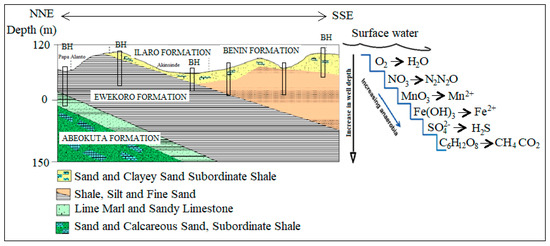 Three to four different hydrogeological units have been identified within the Dahomey and Niger Delta Basins. The unconfined alluvial aquifers along the delta line and major rivers (creek lines), shallow coastal plain sands and intercalations of clay, limestone, tar sands, shale, peats, and upper coal measure underlying different locations within the study area defined the layer boundaries because of their relatively low permeability [34,35,36,37]. The alternating sequence of low and high permeability layers define the three confined aquifers that define groundwater resources of the study area. The top aquifer is shallow with thickness ranging from 8–45 m. The thickness of the second aquifer ranges from 10–35 m, while the third aquifer is about 10–35 m with the depth ranging from 150–240 m [29,38]. The fourth aquifer starts from 200 to 250 m below the ground’s surface, depending on the locations. Generally, the variation in the aquifer characteristics begins from Abeokuta formation (Figure 1) in the North as the lateritic topsoil thins out as it passes through Ilaro, Ewekoro, into Coastal Plain Sand, and Alluvium units towards the sea at the south. Figure 3 shows a typical lithological description of the coastal area from a combined X-ray, resistivity logs, and electrical resistivity tomography.