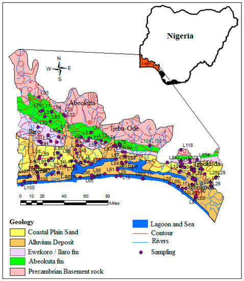 The area is part of the Dahomey basin, which extends from Nigeria to Ghana. The lithological character of the sediments is dictated by a southerly transgression and regression of the sea, which has occurred since the Cretaceous period. The stratigraphic description of the sediments has been provided by various authors [30,31,32]. The Alluvium deposits and coastal plain sands consist of soft, very poorly sorted clayey sands, pebbly sands, sandy clays, and rare thin lignite of Oligocene to recent age [33]. The coastal sands layer is underlain by the Ilaro formation, which consists of massive, yellowish, poorly consolidated, cross-bedded sandstones, which are fine-medium-grained and poorly sorted [32]. The Ilaro formation is followed by the Ewekoro formation, which consists predominantly of Paleocene fossiliferous limestone which becomes arenaceous towards the base [33] and the Abeokuta formation, which consists of lower Cretaceous sandstone and grits with interbedded mudstone unconformity overlying the basement complex fine-grained detrital sandstone, siltstone, and shale overlying the formation in the upperparts. The geology map of the basin is presented in Figure 2 with the groundwater sampling points.