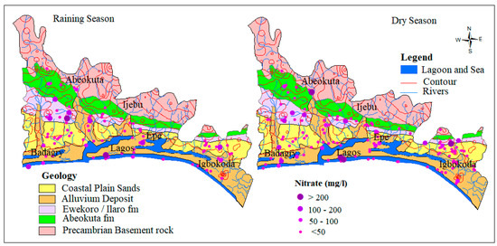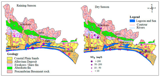 Sulfate in groundwater occurs from both natural and anthropogenic sources. The natural source is linked with the dissolution sulfate/evaporites minerals such as gypsum while the anthropogenic sources could be from municipal and industrial effluents mainly due to sulfur-based waste products. Unmanaged waste disposal is common within the alluvium aquifer along the rivers within the coastal areas. Seasonal flooding in this area likely triggers a biogeochemical reaction of oxidation and reduction which promotes dissolution of sulfate in water. In this study, SO42− concentration in groundwater samples from the dry season range from 0.26–576.3 mg/L with an average of 17.5 mg/L while wet season concentration ranges from 0.08–2.211 mg/L with an average of 37.9 mg/L. The relatively higher average concentration in the dry season water samples revealed the influence of evaporation. The spatial and temporal map, as shown in Figure 4 below, shows that most of the higher concentration samples are found within the coastal plain sands and alluvium deposit of the basin.