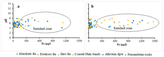 Scatter plots of Fe against pH for (a) wet and (b) dry season.