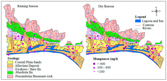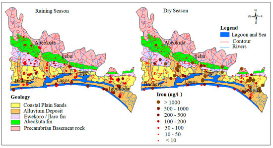 Under anaerobic groundwater may contain ferrous iron at concentrations of up to several milligrams per liter without discoloration or turbidity in the water when directly pumped from a well. On exposure to the atmosphere, however, the ferrous iron oxidizes to ferric iron, giving an objectionable reddish-brown color to the water. In this study, the concentration of Fe ranges from 0.0 to 6.1 mg/L and 0.01 to 136 mg/L and average of 0.3 mg/L and 1.5 mg/L, respectively for wet and dry seasons groundwater samples. The relative higher concentrations and standard deviation observed in the dry season (11.9) compared to wet season (0.8) signifies the possible influence of precipitation/redox driven by evaporations resulting from seasonal variation in precipitation. Scatter plots (Figure 6) between Fe and pH indicates that the higher concentration of Fe predominates the Alluvium and coastal plain sands aquifer. This occurrence is hypothesized to be attributed to the preservation of metals in groundwater by organic/fulvic acid, which commonly characterized the alluvium deposits around the coastal areas [5,47]. This trend can also be observed in spatial distribution map in Figure 7.