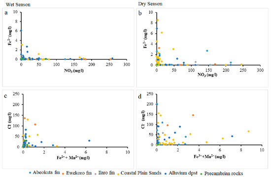 Scatter plots NO3 against Fe2+ (a) wet season (b) dry season and Fe2+ + Mn2+ against Cl− (c) wet season (d) dry season.