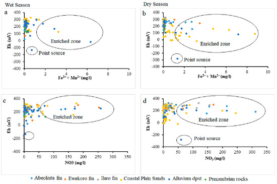 Scatter plots (Fe2+ + Mg2+) against Eh (a) wet season (b) dry season and NO3 against Eh (c) wet season (d) dry season.