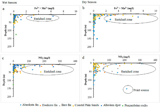Scatter plots (Fe2+ + Mn2+) against well depth (a) wet season (b) dry season and NO3 against well depth (c) wet season (d) dry season.