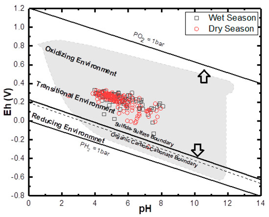 General Eh-Ph diagram for both wet and dry season groundwater samples. The upper and lower stability limits of water are given where PO2 and PH2 = 1 bar. The dry season shows more extensive variation in the thermodynamic phase, while both are generally plotted within the transitional phase.
