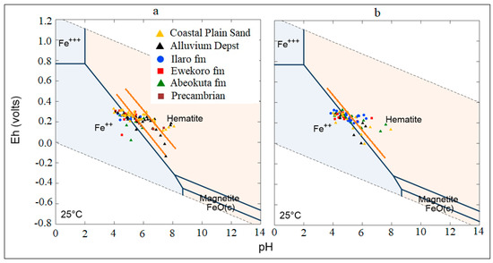 Eh-pH diagram for Iron species in the sampled groundwater (a) Wet season; (b) dry season.