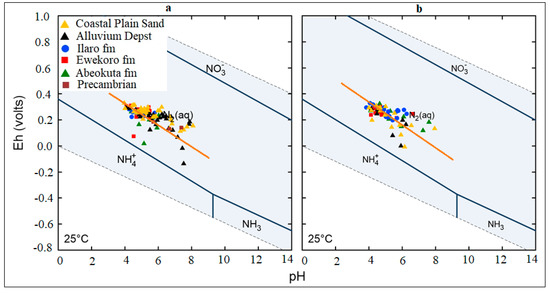 Oxidation/reduction (redox) reaction potential of groundwater (Eh) plays a vital role in the geochemical processes that occur in groundwater. Redox is defined as the transfer of electrons. Redox reactions are crucial in aqueous environmental geochemistry. Eh measurements are useful in identifying the redox zones as its value decreases with increases in residence time [28,50]. Change in pH and Eh have been identified as controlling factors in the mobilization and remobilization of ions and metals in surface and groundwater of the shallow aquifer of the EDB basin (Figure 9).