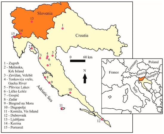 A long-term isotopes-in-precipitation record (1976–2018) exists in Croatia only for the Zagreb station [27,47,62] (although microlocations have changed, as will be explained later). Data for some other stations with shorter monitoring periods were obtained during various individual projects (location numbers 1 to 12, Figure 1) [18,47,62,63,64,65,66,67,68]. Details on sampling sites are presented in Table S1. Some projects have also included monitoring at stations in Slovenia (location numbers 13 to 15, Figure 1), e.g., in Ljubljana [47,62,69,70,71], Portorož, and Kozina [47,72,73].