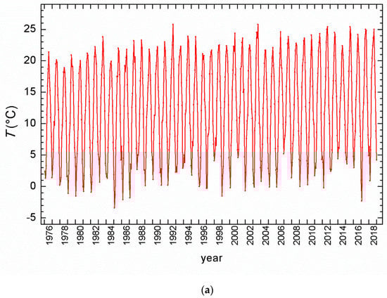Minimal monthly (mean air) temperatures at Zagreb for the 1976–2018 period ranged from −3.4 °C (in 1985) to 5.4 °C (in 2014) (Figure 2a). They were measured in January (in 21 cases, or 49%), February (12 cases, or 27.9%), and December (9 cases, or 20.9%), and only once, in 1988, was the coldest month November. The highest monthly temperatures, in a range from 18.9 °C (1978) to 25.8 °C (1992, 2003) were measured in 26 out of 43 years (60.5%) in July, 15 times (35%) in August, and only in 2 cases in June (1979 and 1996).