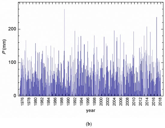 The annual precipitation amount ranged from 521 mm (2011) to 1234 mm (2014) (Table 1), while the maximal monthly precipitation amount occurred in August 1989 (260 mm), followed by 236 mm in September 2017 and 208 mm in September 2014. In all other months, the monthly amount of precipitation was below 200 mm (Figure 2b).