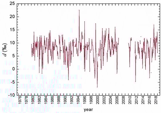 Deuterium excess d was calculated from paired monthly data according to Equation (3). Some precipitation samples showed very low (highly negative; in our case, the lowest value was −13‰) d-excess values. This can be caused by improper sampling (e.g., the precipitation stayed for the whole month in a sample collector), by evaporation due to a low amount of precipitation and/or high temperatures, or by the evaporation/sublimation of raindrops falling in a dry atmosphere [50,51,71].