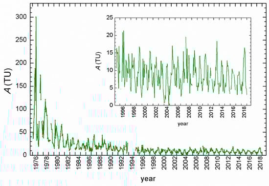 Complete record of monthly tritium activity concentration (A) in precipitation at Zagreb, 1976–2018. Insert: for the 1995–2018 period.