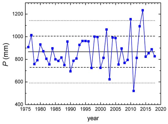 Annual precipitation amount P in Zagreb, 1976–2018 period. Solid line: the mean value for the whole period; dashed lines: ±1σ; dotted lines: ±2σ.