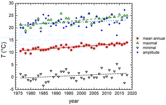 Mean annual temperature and the minimal and maximal monthly temperature within a year (Figure 7) showed a significant increase at a 95% confidence level (p < 0.05) (a mean value of 0.071 ± 0.008 °C per year (r = 0.82), a minimal value of 0.05 ± 0.08 °C/year (r = 0.33), and a maximal value of 0.09 ± 0.02 °C per year (r = 0.69)). Since both the minimal and maximal monthly temperatures increased, but with different gradients, the result was that the increase in the amplitudes of the air temperatures (0.04 ± 0.03 °C per year, r = 0.26, p = 0.09) was significant at a 90% significance level (Figure 7).
