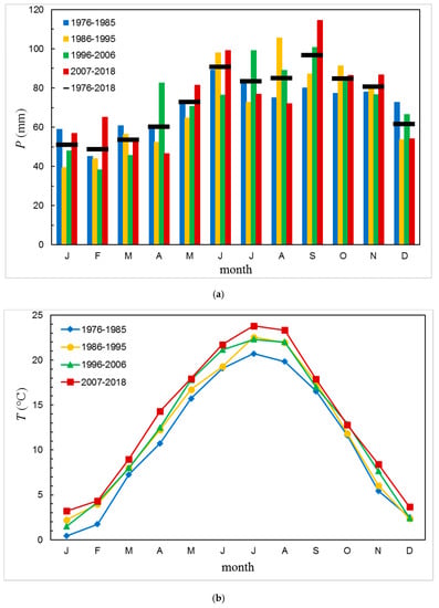 (a) Monthly mean precipitation amounts for the four subperiods and the average value for the whole period; (b) monthly mean air temperature for the subperiods.