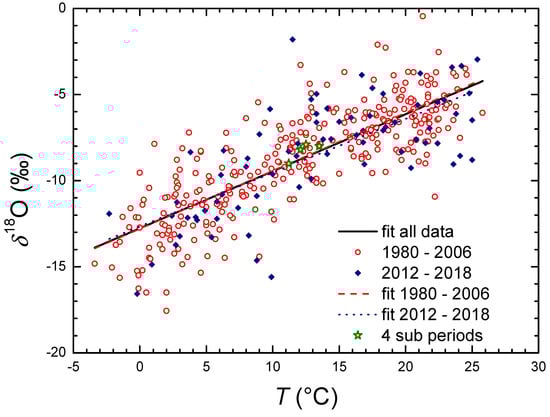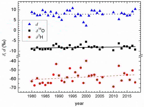 Changes in the weighted mean annual values of δ18O, δ2H, and d-excess in the studied 1980–2018 period are shown in Figure 9 together with their respective trends. The δ18O and δ2H values exhibited increases, with an increase rate of 0.017‰ ± 0.014‰ per year (r = 0.21, p = 0.23) for δ18O and 0.14‰ ± 0.11‰ per year (r = 0.23, p = 0.19) for δ2H. The annual mean d-excess remained constant (slope ≈ 0). The corresponding weighted mean values for the periods 1980–2006 (as well as for the shorter subperiods) and 2012–2018 are shown in Table 2. Both the δ18O and δ2H values were higher in the more recent period, 2012–2018, than from 1980 to 2006. We observed a similar trend earlier: the mean δ18O in the 2001–2003 period (−8.3‰) was more positive than the long-term mean δ18O (−8.8‰) [76]. However, it was noticed (Table 2) that the values in the 1996–2006 and 2012–2018 periods were practically the same, although the temperature differed in these periods.
