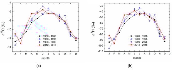 To investigate which months contributed most to the changes in the mean annual values of δ18O and δ2H, we calculated the monthly mean δ18O values in the four subperiods (Figure 10). The most pronounced differences were observed in the first half of the year, with higher values in the 2012–2018 period than in earlier years in January, March, and April, while in February, the most recent δ18O and δ2H were the lowest. The differences in the second half of the year were not large. This is behavior similar to that described earlier for the monthly mean temperature (Figure 8b). However, while the summer temperatures (June, July, and August) were the highest in the most recent period, the δ18O and δ2H were not.