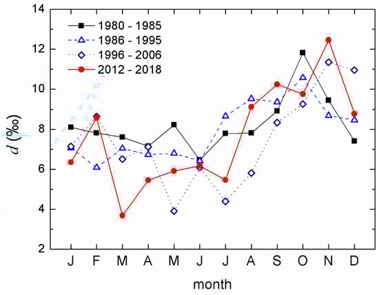 In previous analyses [47,76], it was demonstrated that the deuterium excess values for Zagreb’s precipitation were higher in autumn than in the spring. The same occurred in this study using monthly mean values of d-excess for the four periods, 1980–1985, 1986–1995, 1995–2006, and 2012–2018 (Figure 11). In all periods, values from January to June (<8‰) were lower than those in the second half of the year (>8‰). While in the first half, there was a slight decrease in the newer periods (7.6 ± 0.6‰ in 1980–1985 to 6.0 ± 1.6‰ in 2012–2018), the d-excess values in the second half of the year showed an increasing trend. Such an interplay of decreases and increases of the monthly mean values eventually resulted in no change in the mean annual d-excess values over the whole studied period, as was shown earlier (Figure 9, Table 2). The higher d-excess in autumn (Figure 11) indicates a higher influence of the Mediterranean air masses in these months. It is interesting to note the shift of the autumn peak in the d-excess value from October (in 1980–1985) to November in the 2012–2018 period. Such behavior resembled the changes in the monthly precipitation amount in autumn (Figure 8a). November was the only month in which a significant increase in d-excess in the whole period was observed, with a rate/slope of 0.14‰ ± 0.04‰ per year (n = 35, r = 0.54, p < 0.05).